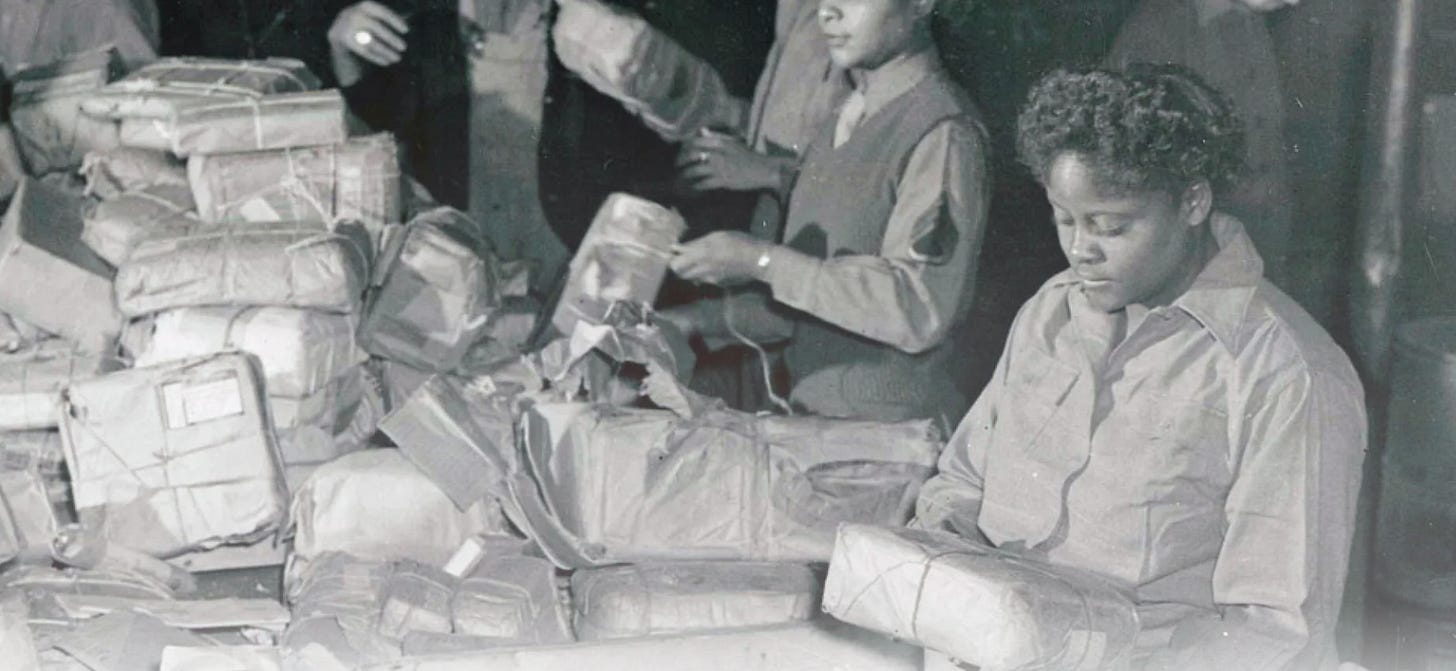 ‘Writing in 1942, the United States Postmaster General argued that “frequent and rapid communication with parents, associates, and other loved ones strengthens fortitude, enlivens patriotism, makes loneliness endurable, and inspires to even greater devotion the men and women who are carrying on our fight far from home and from friends.” In the words of the 6888th Central Postal Directory Battalion's motto,