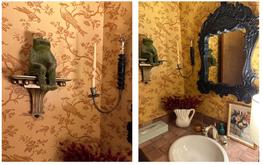 This week’s visit to The Loo is a beautiful one. A family one. A hopeful one. Over the years, I’ve sat and looked at this green guy on a pedestal on the wall as I nip away from a family meal. He sits and stares. He sits while I sit. Presumably the men stand while he sits. We share time together. No words or motivational phrases in this loo, but I always hope he will still be there for my next visit.